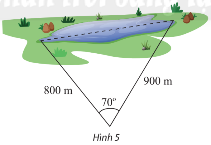 Tính khoảng cách giữa hai điểm ở hai đầu của một hồ nước. Biết từ một điểm cách hai đầu hồ lần lượt là 800 m và 900 m người quan sát nhìn hai điểm này dưới một góc 70o (Hình 5).