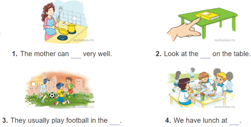 Bài 11. Complete the sentences with school, cook, book and afternoon and say them aloud. (Hoàn thành các câu và đọc to chúng lên.)