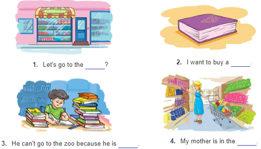Bài 16. Complete with the following words: supermarket, book, busy, bookshop and say the sentences aloud. (Hoàn thành với các từ sau: supermarket, book, busy, bookshop và đọc to các câu.)