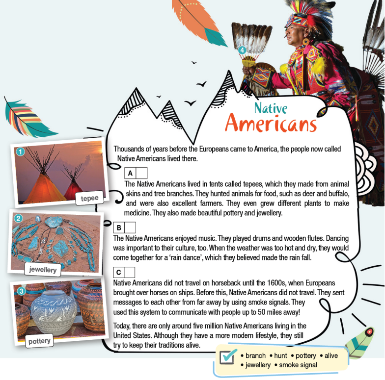1. What do the title and the pictures tell you? Read the text to find out. 2. a) Match the headings (1–4) to the paragraphs (A–C). There is one extra heading.b) Listen, read and check. 3. Read the text again and decide if each of the statements (1–4) is T (true) or F (false). 4. a) What were people in your country like in the past? Use the headings in Exercise 2 to collect information about them. Present it to the class. b) Write a short paragraph about how people in your country lived, using