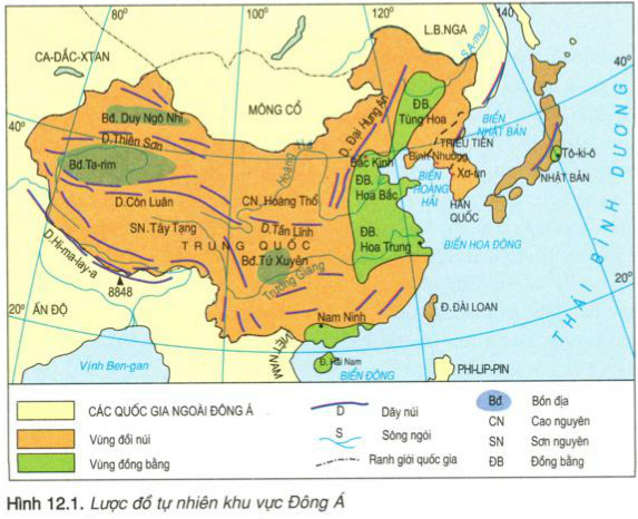 Dựa vào hình 12.1, em hãy cho biết: Khu vực Đông Á bao gồm những quốc gia và vùng lãnh thổ nào? Các quốc gia và vùng lãnh thổ Đông Á tiếp giáp với các biển nào?
