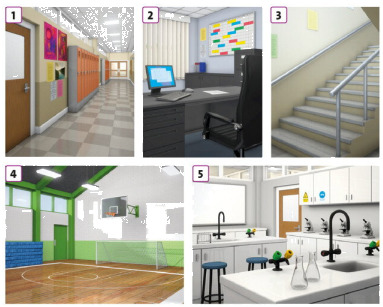 canteen (căng tin); classroom (phòng học); corridor (hành lang); gym (phòng tập thể dục); hall (hội trường); library (thư viện); head teacher's office (phòng hiệu trưởng); language lab (phòng thí nghiệm ngôn ngữ); playground (sân chơi); playing field (nhà thi đấu); reception (lễ tân); science lab (phòng thí nghiệm khoa học); staff room (phòng giáo viên); stairs (cầu thang); store room (nhà kho); toilets (nhà vệ sinh)