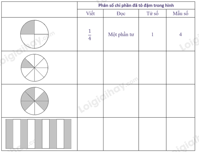 a) Viết thương của mỗi phép chia sau dưới dạng phân số: 3 : 5 = ..................... Viết phân số chỉ phần tô đậm trong mỗi hình dưới đây (theo mẫu)