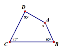 Theo định lí về tổng các góc của một tứ giác, ta có ˆA+ˆB+ˆC+ˆD=3600. Do đó ˆA=x=3600−850−750−650=1350