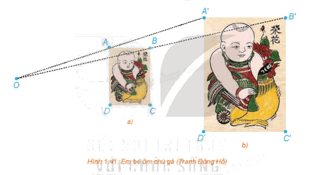 Quan sát hai bức tranh em bé ôm chú gà ở phần mở đầu bài học và chỉ ra phép vị tự biến bức tranh nhỏ thành bức tranh lớn và phép vị tự biến bức tranh lớn thành bức tranh nhỏ.