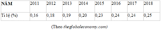 Bảng thống kê sau cho biết tỉ lệ đóng góp vào GDP toàn cầu của Việt Nam trong một số năm.