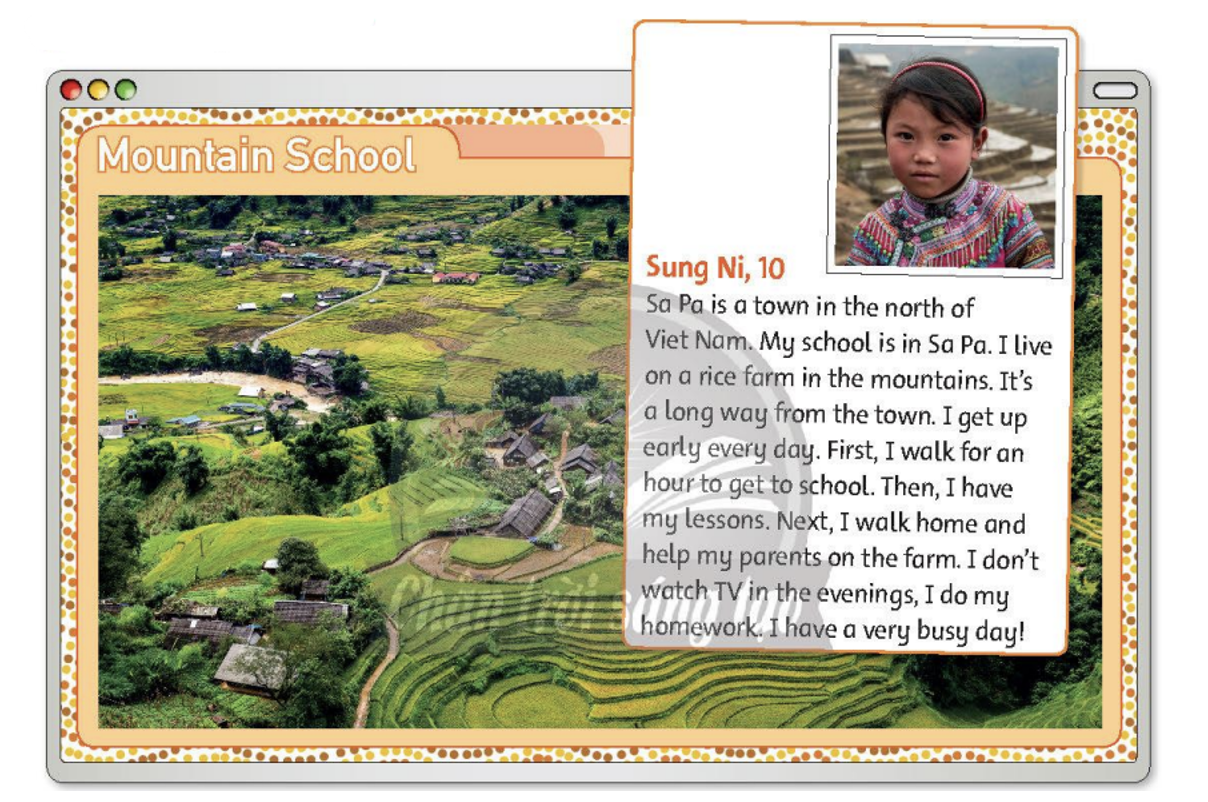 Listen, point, and repeat. Look at the text. Where does Sung Ni live? Listen and read. Read again and write T (true) or F (false). How do children get to school in other country.