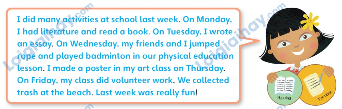 I did many activities at school last week. On Monday, I had literature and read a book. On Tuesday, I wrote an essay. On Wednesday, my friends and I jumped rope and played badminton in our physical education lesson. I made a poster in my art class on Thursday. On Friday, my class did volunteer work. We collected trash at the beach. Last week was really fun!