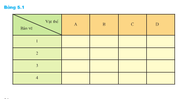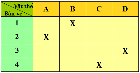 Đọc các bản vẽ hình chiếu 1, 2, 3, 4 (h.5.1) và đối chiếu với các vật thể A, B, C, D (h.5.2) bằng cách đánh dấu (x) vào bảng 5.1 để chỉ rõ sự tương ứng giữa các bản vẽ và các vật thể. Hãy vẽ các hình chiếu đứng, chiếu bằng và chiếu cạnh của một trong các vật thể A, B, C, D.