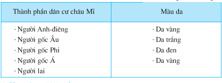 Dựa vào bảng sau, hãy cho biết thành phần dân cư của châu Mĩ.