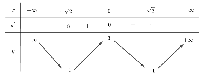 Câu 7: Hàm số y=x4−2x2−1 đạt cực trị tại các điểm x1;x2;x3. Tính S=x1+x2+x3?