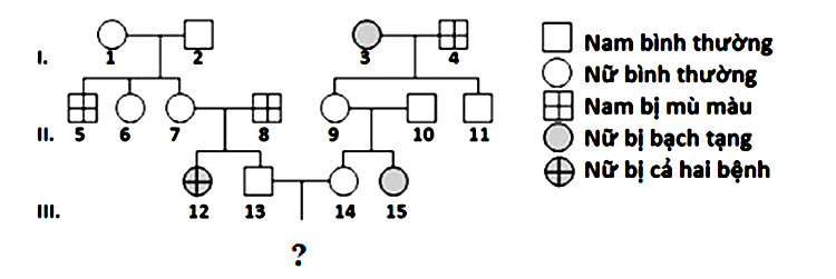 Câu 108. Ở người, gen quy định dạng tóc nằm trên NST thường có 2 alen, alen A quy định tóc quăn trội hoàn toàn so với alen a quy định tóc thẳng. Bệnh mù màu đỏ - xanh lục do alen lặn b nằm trên vùng không tương đương của NST giới tính X quy định, alen B trội quy định mắt nhìn màu bình thường. Cho sơ đồ phả hệ: