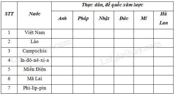Phong trào đấu tranh giành độc lập dân tộc của nhân dân các nước Đông Nam Á giữa hai cuộc chiến tranh thế giới chống lại nước thực dân, đế quốc nào duới đây? (đánh dấu x vào mỗi cột cho sẵn trong bảng):
