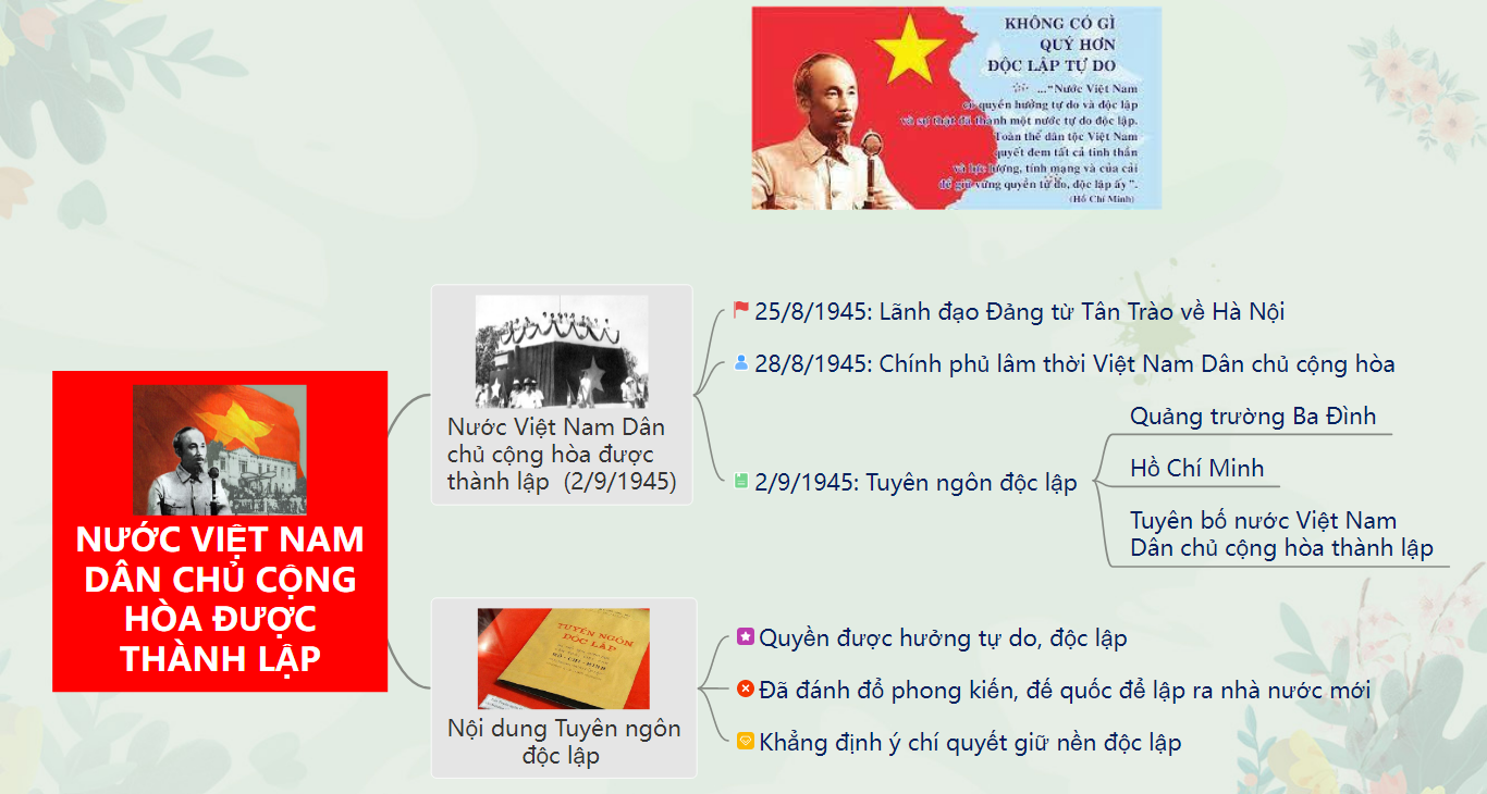 | Sự thành lập nước Việt Nam Dân chủ Cộng hòa và những nội dung chính của bản Tuyên ngôn độc lập. |