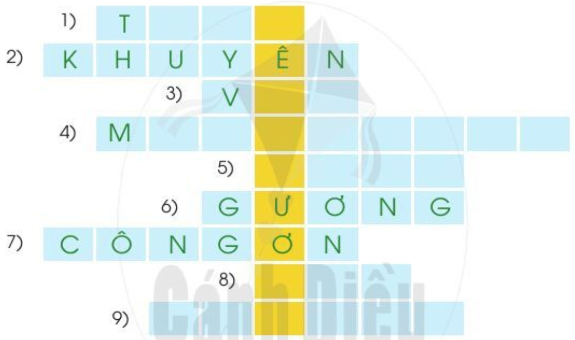 Câu 1: Dựa vào gợi ý, tìm chữ cái phù hợp với mỗi ô trống để hoàn thành các từ theo từng dòng. Đọc từ mới xuất hiện ở cột tô màu vàng.