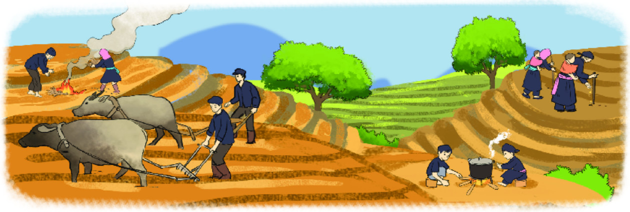 Trên nương, mỗi người một việc. Người lớn đánh trâu ra cày. Các cụ già nhặt cỏ, đốt lá. Mấy chú bé bắc bếp thổi cơm. Các bà mẹ tra ngô. Các em bé ngủ khì trên lưng mẹ.