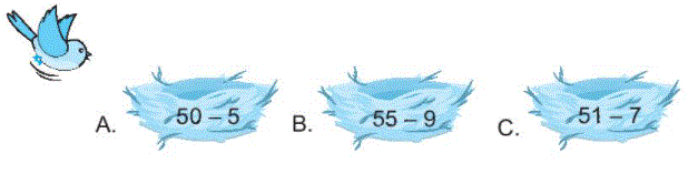 Đặt tính rồi tính. 45 – 6 20 – 9 72 – 4 80 – 7 Viết số thích hợp vào chỗ trống. Khoanh vào chữ đặt trước câu trả lời đúng. Bạn chim sẽ vào tổ ghi phép tính có kết quả lớn nhất. Bạn chim sẽ vào tổ nào? Viết mỗi số 40, 50 và 70 vào một ô trống để được phép tính đúng.