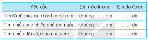 Em hãy ước lượng độ dài các đồ vật theo yêu cầu rồi dùng thước kẻ đo lại. Ghi kết quả vào bảng. Em hãy tìm ba đồ vật trong nhà để đo chiều cao (theo đơn vị là đề -xi-mét) rồi ghi lại vào bảng.