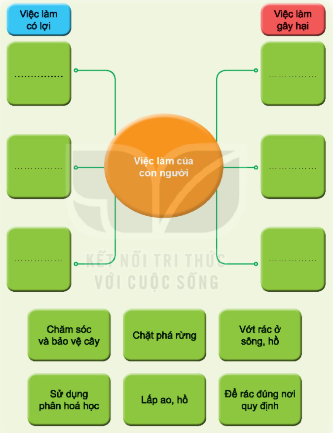 1. Lựa chọn thẻ chữ và hoàn thành sơ đồ về những việc làm thay đổi môi trường sống của thực vật và động vật theo mẫu sau: