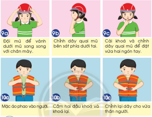 1. Thực hành và chia sẻ với các bạn về việc đội mũ bảo hiểm và mặc áo phao đúng cách.
